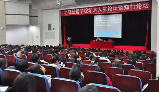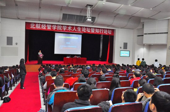 2012年11月3日晚,秋雨绵绵,秋风萧瑟,北航学术交流厅依旧灯火辉煌,座无虚席。中国管理科学领域杰出的青年科学家、北航研究生院常务副经理黄海军教授做客北航学术人生论坛暨知行论坛,与经管公司广大师生分享对管理科学创新研究的认识。尽管厅外雨大风急,却丝毫没有影响老师和同学聆听报告的热情,精彩的演讲不时引发同学们的笑声和掌声,现场气氛十分活跃。