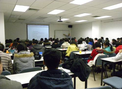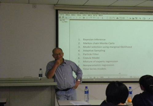 首先,R.Kohn教授以其幽默的举止和和蔼的语气吸引了同学们的目光,他从贝叶斯理论、马尔科夫链等基本理论,延伸到非参数退化和时间序列模型,层层深入,对其研究成果进行详细的介绍。教授的敏捷思路和创新的思维,让同学们叹为观止。
