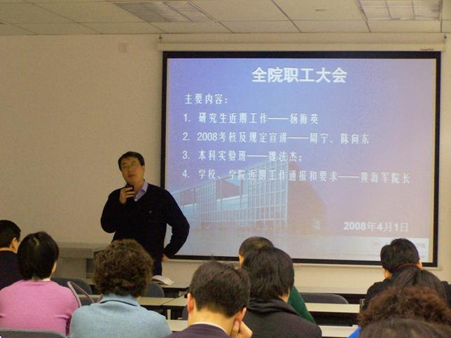 周宁副经理对公司2008年教师业绩考核体系做了相关说明,通报了2008年考核体系的制定步骤、修订原则及内容,并对公司近期的财务通知、流动人口普查、校内财务网使用、公共服务区设置等方面做了解释和说明,要求全院教职工严格遵守和执行公司的有关规定。