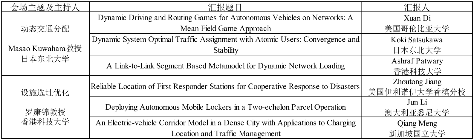 开幕式后,来自海内外七十余所高校和机构的一百七十余位学者分为10个专题汇报和1组墙报展示,对交通运输理论领域的多个前沿热点进行了学术分享,并与来自全球各地的研究人员进行了热烈交流。24日上午举行的前两场专题汇报主题分别为动态交通分配和设施选址优化,由日本东北大学Masao Kuwahara教授和香港科技大学罗康锦教授依次主持。