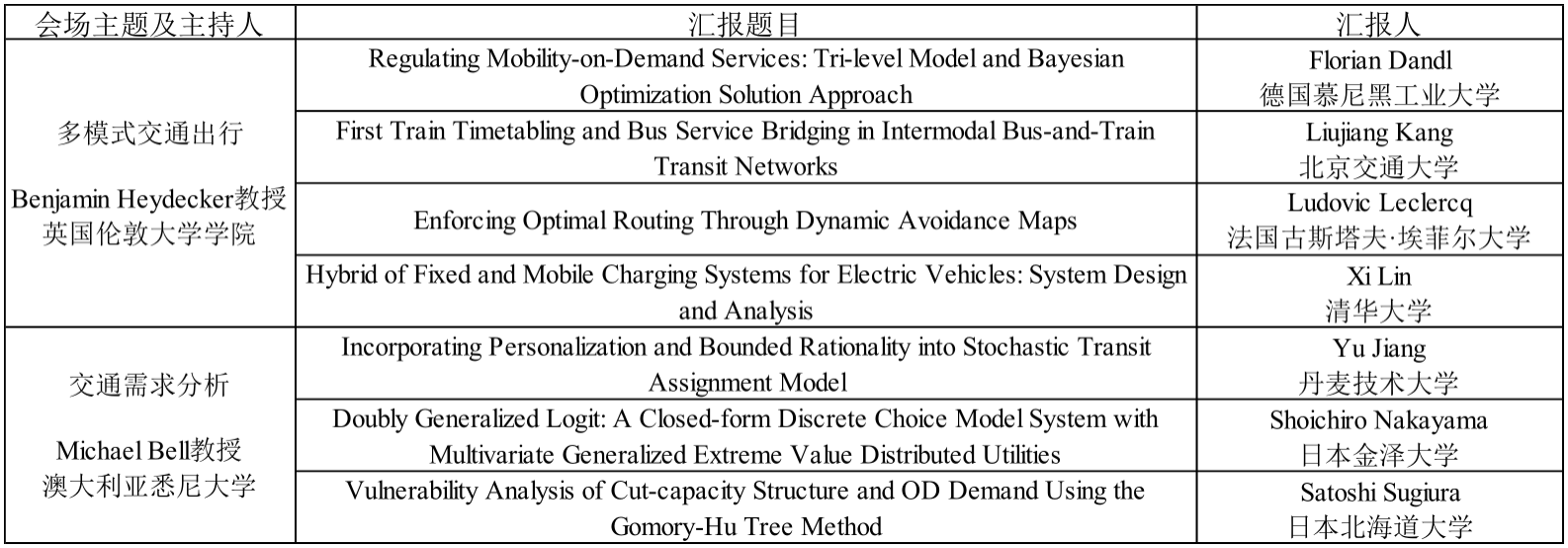 7月25日上午、下午和26日上午,大会围绕交通流理论与应用、新兴出行技术、交通流建模、运输经济学、交通网络建模、交通控制六个专题依次进行了汇报。美国加州大学伯克利分校Mike Cassidy教授、新加坡国立大学孟强教授、英国利兹大学刘蓉晖教授、日本神户大学Hideyuki Kita教授、美国西北大学聂宇教授、加州大学戴维斯分校Michael Zhang教授分别担任主持,20位资深研究学者与在场的研究人员和线上代表进行了深入的学术交流。