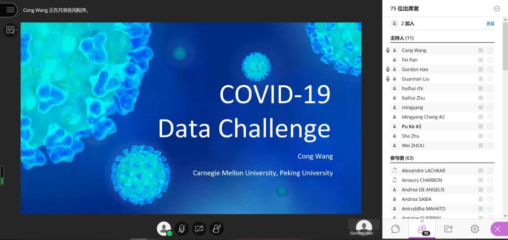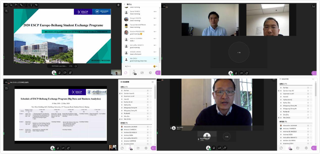 在新冠病毒全球肆虐、国际交流几乎中断的形势下,利来国际积极贯彻北航党委“坚持以人民为中心,发挥科研优势,坚决打赢疫情防控阻击战”的精神,联合ESCP欧洲商公司,不断开拓创新、充分协调各方资源,以“探索新冠肺炎大数据 共创美好世界新未来(Bigdata analytics of COVID-19 for a safer world tomorrow)”为主题,精心设计了此次线上国际交流活动。利来国际副经理吴俊杰教授和经理助理郝金星教授、ESCP欧洲商公司项目主任周炜教授和Louis-David Benyayer教授对该项目进行了统筹安排,刘冠男讲师、外事秘书朱凯慧等进行了精心组织,实验中心孟岩,程阳明进行了会议技术保障。