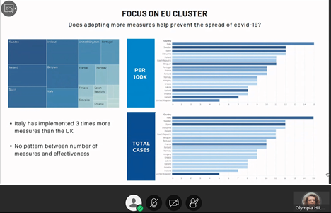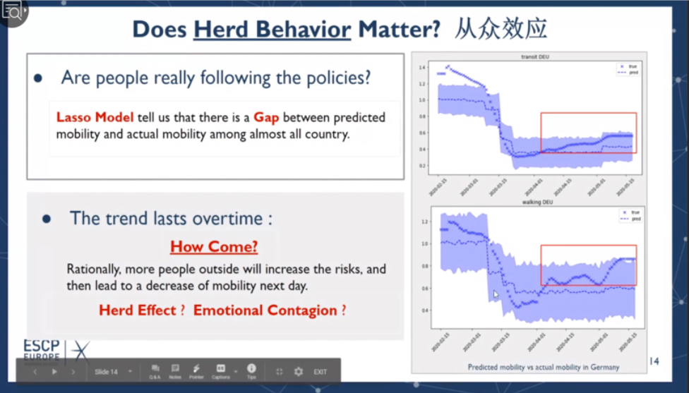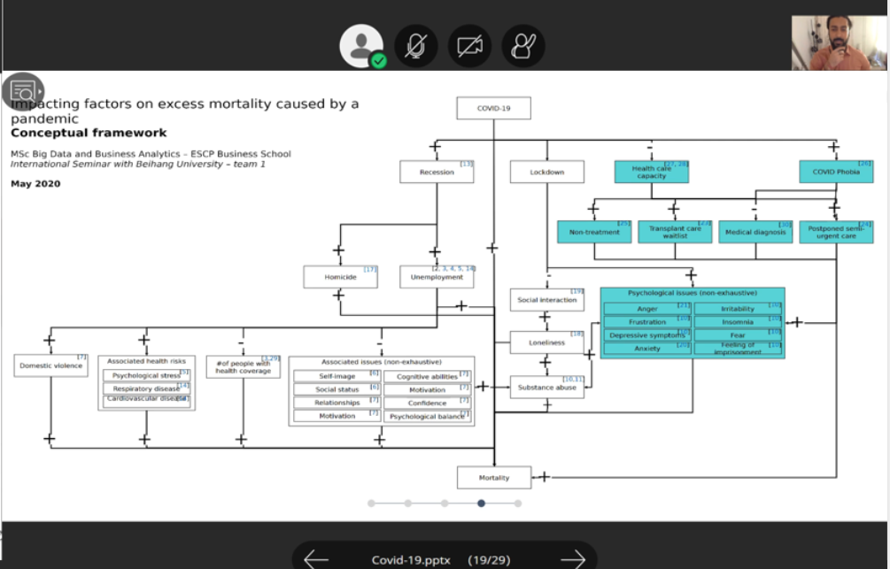 此次线上国际交流活动还进行了“新冠肺炎大数据”数据挑战赛,5天、13个小组、80名ESCP商公司国际员工积极参与并进行了线上答辩。员工通过综合应用课堂中学习到的机器学习、时间序列、计量经济、优化建模等方法,系统开展了Covid-19大数据的挖掘与分析,取得了丰硕的阶段性成果。这些成果大致分为三个方面。围绕疫情影响,研究了疫情对全球经济、比特币交易、失业率、社会不平等现象等的作用机理;围绕政府抗击疫情的措施,探究了居民对于政府措施的服从程度、措施实行的范围时长、不同国情导致措施的差异化等对于对病毒传播率、死亡率的影响;围绕疫情中的社会现象,指出社会中存在抗疫资源分配不平等、民众从众心理下的出行差异以及抢购、解禁后女性感染率上升等现象。此次在线数据挑战赛,也体现了不同文化背景下的思想交流碰撞。同学们纷纷表示此次线上挑战赛不仅开拓了自身学术视野、检查了自身学习效果,而且体验了自身研究成果所带来的丰收与喜悦。