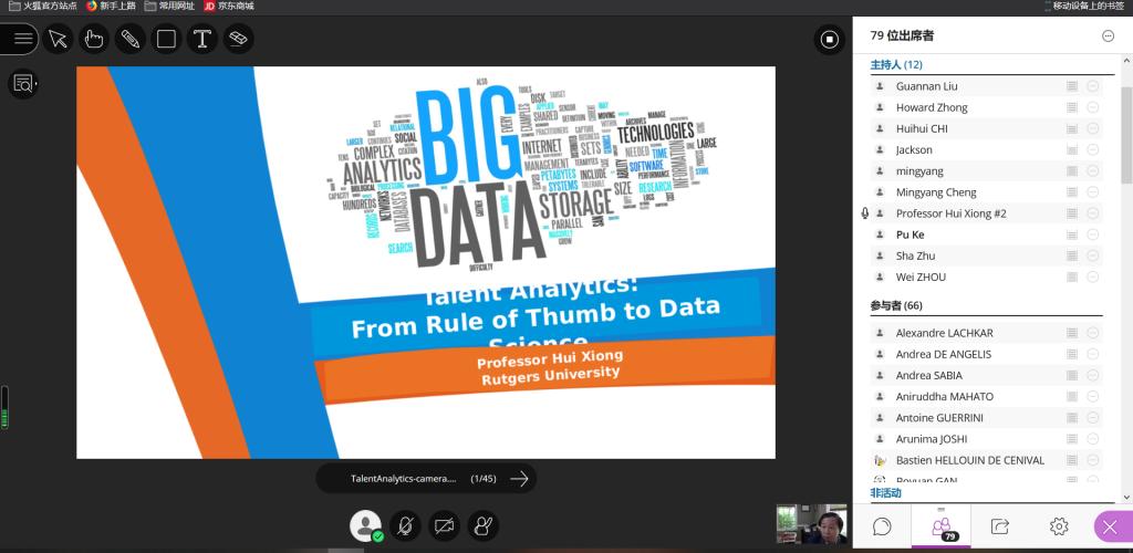 此次线上国际交流活动名师荟萃,跨越三个不同时区、来自三所世界著名高校和两所著名企业的专家学者开展了五场精彩学术报告。IEEE会士、美国罗格斯大学熊辉教授旁征博引以“人才大数据分析”为题进行了主旨发言,SAP中国研究院总监徐磊高屋建瓴宣讲了系列新时代企业智能化转型案例。