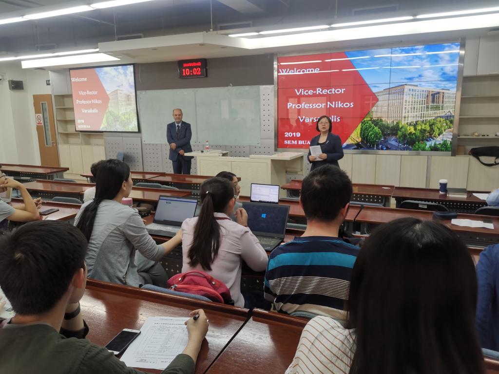 2019年5月14日,希腊亚里士多德大学副董事长Nikos Varsakelis教授受邀来到北航经管公司,为师生带来两场特邀报告。利来国际经理范英教授代表公司致辞,对Nikos Varsakelis教授的到来表示欢迎和感谢。两场报告分别由经管公司吴俊杰教授、秦中峰教授主持,80余名师生参加了此次报告会。