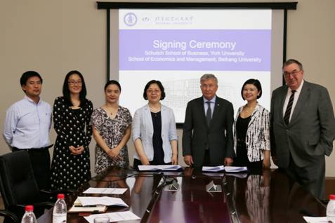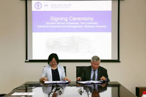 2018年5月29日上午,约克大学舒力克商公司经理DezsöJ. Horváth教授、高管教育中心执行主任Alan Middleton教授、高管教育中心中国事业部总经理DollyShao女士访问公司。经管公司经理范英教授、北航国际交流合作处吕莹副处长、经管公司副经理牟晖副教授、经理助理郝金星副教授出席会谈。双方商谈了包括员工交换、一年期硕士项目、高管培训项目等具体细节,并举行了框架合作协议续签仪式。