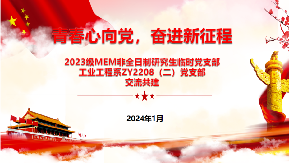近日,2023级MEM非全日制研究生临时党支部与工业工程系ZY2208(二)党支部携手开展“青春心向党,奋进新征程”支部共建活动。经济管理公司党委副书记高超,北航MEM教育中心主任闪四清、副主任程玉辉,2023级MEM非全日制研究生临时党支部以及ZY2208(二)党支部党员和入党积极分子共计60余人参加活动。本次会议由2023级MEM非全日制研究生临时党支部书记李彬同学和ZY2208(二)党支部书记谢纪帆同学共同主持。
