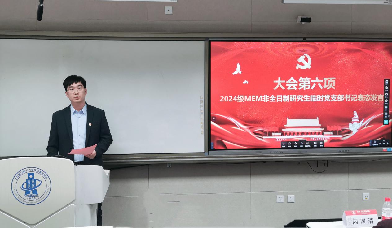 2024级MEM非全日制研究生临时党支部书记焦道伟代表全体支委郑重表态。第一,加强学习建设,争创学习型支部,带动党员队伍政治素质和业务素质整体提升;第二,抓好制度建设,争创制度性支部,规范和完善临时党支部各相规章制度;第三,深化学风建设,争创服务型支部,紧密团结全体同学,尽职、尽责、尽心、尽力完成各项工作。