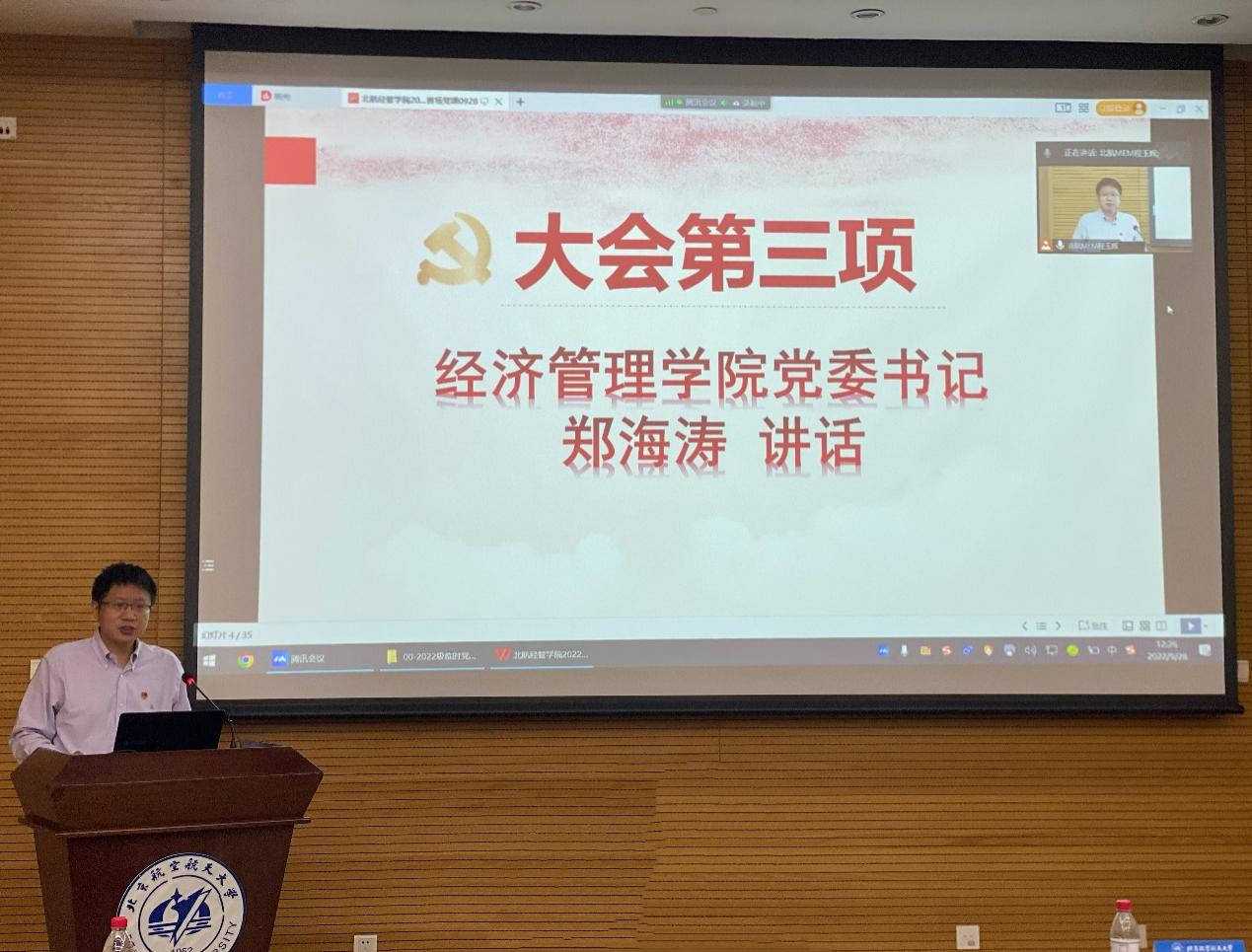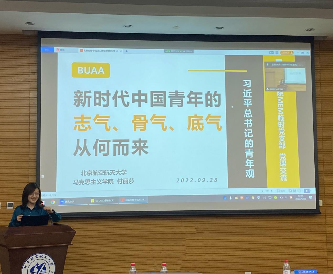 2022年9月28日,北航MEM2022级非全日制研究生临时党支部成立大会暨首场党课在新主楼会议中心第八会议室顺利开展。北航经济管理公司党委书记郑海涛、经济管理公司党委副书记高超、马克思主义公司基础教研部支部书记付丽莎、北航MEM教育中心老师及2022级40余名员工党员参加本次会议。大会采用“线上+线下”相结合的形式召开,由北航MEM教育中心副主任程玉辉主持。