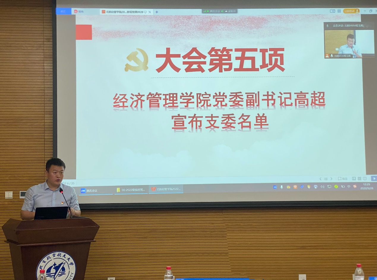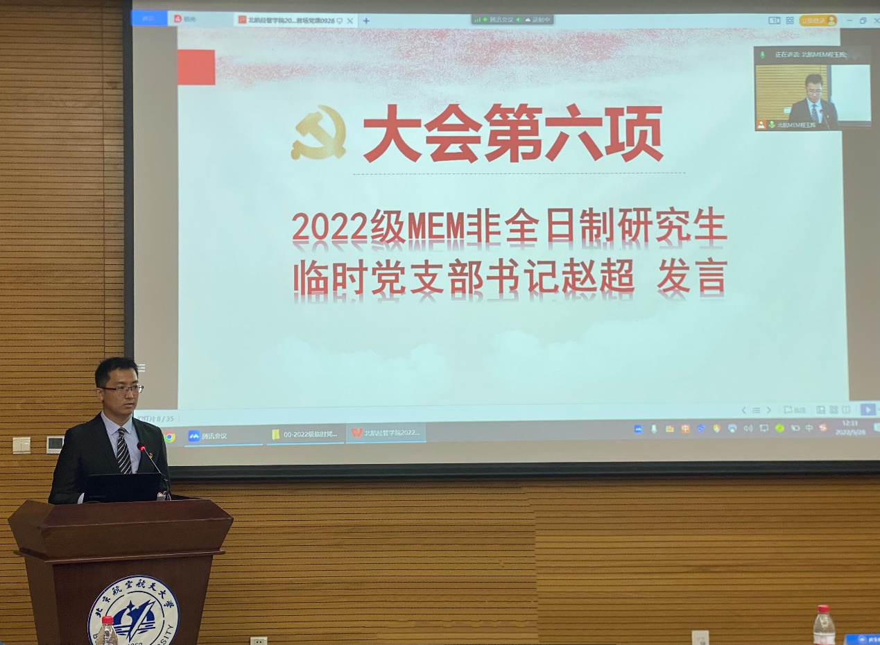 北航经济管理公司党委副书记高超宣读北航MEM2022级非全日制研究生临时党支部书记及支委名单。北航MEM2022级非全日制研究生临时党支部书记赵超同学代表支部成员就政治思想工作郑重表态:自觉在思想上、政治上、行动上同以习近平同志为核心的党中央保持高度一致;向2020级、2021级非全日制研究生临时党支部学习支部建设经验,整体提升党员队伍政治素质和业务素质;积极组织开展多种形式的学习活动,坚持把学习作为提升工作能力的首要任务;以党员标准严格要求自己,做好党员先锋表率作用。