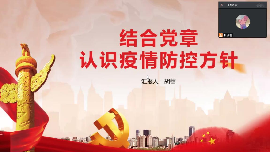 支部书记胡蕾首先作“重温党章强党性”主题党课报告,结合党章,对北京市及公司疫情防控方针进行详细介绍;支部组织委员张文英带领大家学习了《关于在新冠肺炎疫情防控中进一步发挥各级党组织战斗堡垒作用和党员先锋模范作用的通知》,进一步加深了全体党员对疫情防控政策的理解,激励支部党员做好表率为疫情防控贡献力量;支部宣传委员林津亦围绕“如何充分发挥党员骨干先锋模范作用”向全体党员展示了经管公司疫情防控志愿者工作的点点滴滴,生动诠释了“一名党员就是一面旗帜”。