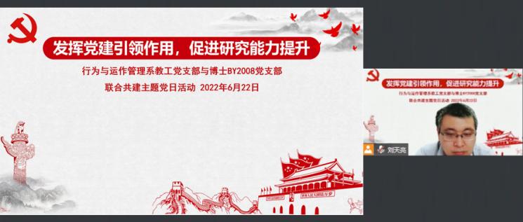 2022年6月22日下午2点30分,利来国际行为与运作管理系教工党支部和博士生BY2008党支部近50名师生在线开展了以“发挥党建引领作用,促进研究能力提升”为主题的联合共建活动,加强了公司教师和博士生之间的交流互动,进一步推动了党建与科研业务的深度融合。本次共建活动由行为与运作管理系教工党支部书记刘天亮同志主持。