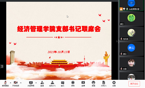 2021年10月13日中午,经济管理公司党委召开支部书记联席会视频会议,传达公司级党委书记联席会精神,公司党委书记刘志新主持会议,师生支部书记、员工工作负责人和专职组织员近40人参加会议。