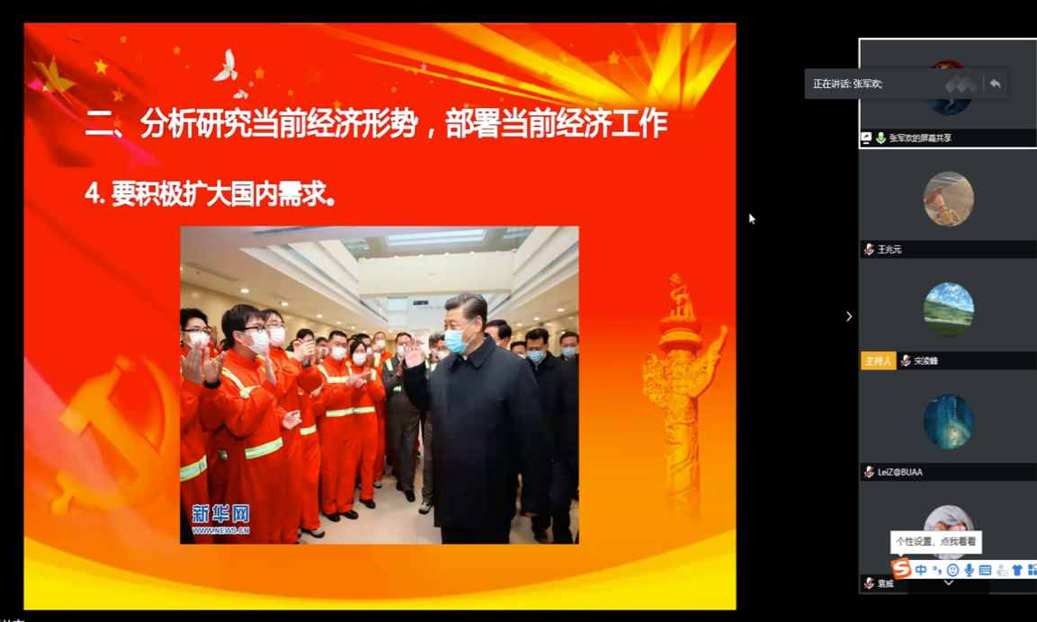 公司张军欢老师带领与会的党员和学者深入学习了《习近平总书记关于新冠肺炎疫情防控的重要讲话精神》。依据中共中央政治局4月17日的会议精神,从疫情防控和经济建设两个方面进行了系列重要讲话和新闻的分析解读。从疫情防控方面,我们要牢牢把握“内防反弹,外防输入”的方针,对我国当前向好的疫情防控态势作进一步巩固。从经济建设方面,我们要仔细分析研究当前经济形势,部署经济工作,稳中求进,坚决打好脱贫攻坚战,积极扩大内需,稳定就业,进一步完善要素市场化配置。