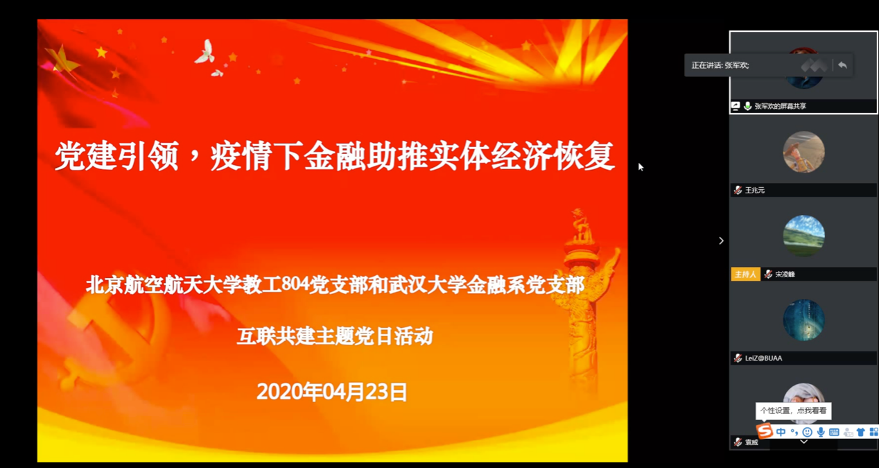 2020年4月23日下午,利来国际教工804党支部联合武汉大学经济与管理公司金融系党支部在线召开“党建引领,疫情下金融助推实体经济恢复”的互联共建主题党日活动。