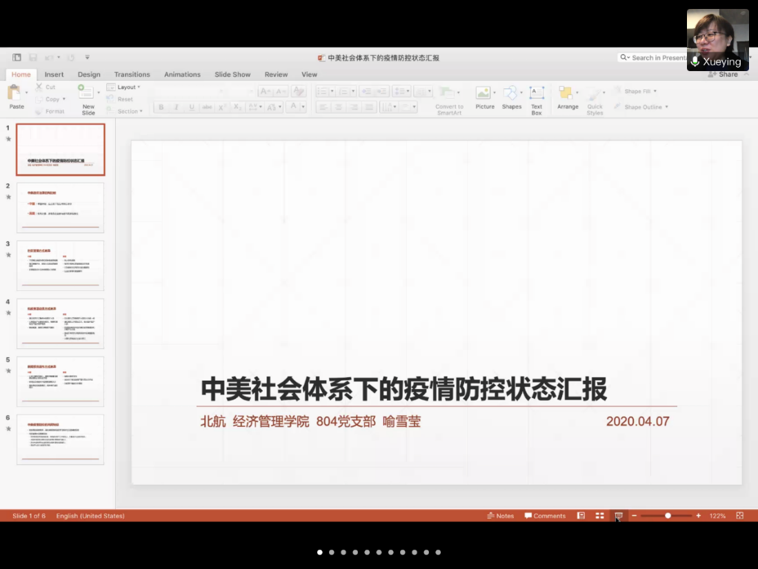 博士生王宇讲述了她在美国芝加哥大学访学的见闻。她谈到当地政府已经开始对民众聚集出行进行管控,但全国上下统一思想、统一行动的中国力量是其他国家所缺少的。她表示,中国抗疫工作充分体现了中国特色社会主义制度和国家治理体系的优势。首先习近平总书记亲自指挥、亲自部署,各地方政府积极行动,基层党组织雷厉风行,党员冲锋在前,展现了中国共产党不屈不挠的昂扬斗志。其次,党中央时刻关心人们,以人民为中心,把人民群众生命安全和身体健康放在第一位,体现了我国以人为本的价值追求,同时人民也充分相信党的正确领导,积极参与,体现了党和人民的鱼水之情。第三,社会主义具有强大的动员、协调能力,各省市能够互帮互助,体现了国家治理体系和集中力量办大事的优势。这些都向世界展现了中国的大国担当和对人类发展的高度责任感,也说明只有各国政府团结一致,抛开意识形态、地缘政治因素,才能共同战胜疫情,维护全球经济稳定。