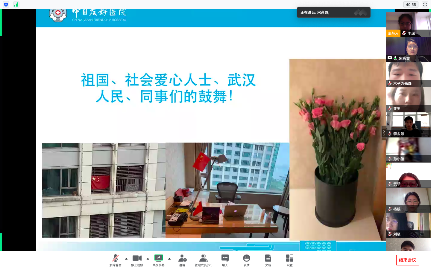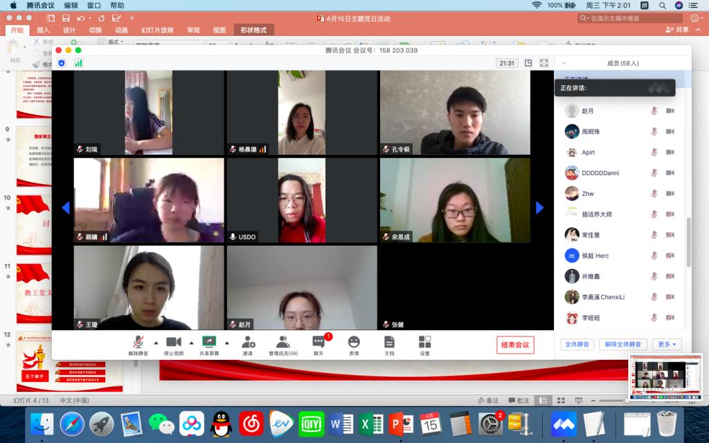 4月15日,在学习习近平总书记给北京大学援鄂医疗队全体“90 后”党员的重要回信精神的号召下,北航经管公司硕士ZY1808(三)、ZY1808(二)党支部与北京大学公共卫生公司营养与食品卫生学系研究生党支部的60余名党员同志共同开展了“学习抗疫先进事迹——北大北航主题党日联合活动”。活动邀请到国家第五批援鄂医疗队员宋肖霞同志为大家分享抗疫先进事迹。经管公司党委书记刘志新、副经理牟晖、教师李晨溪出席活动。