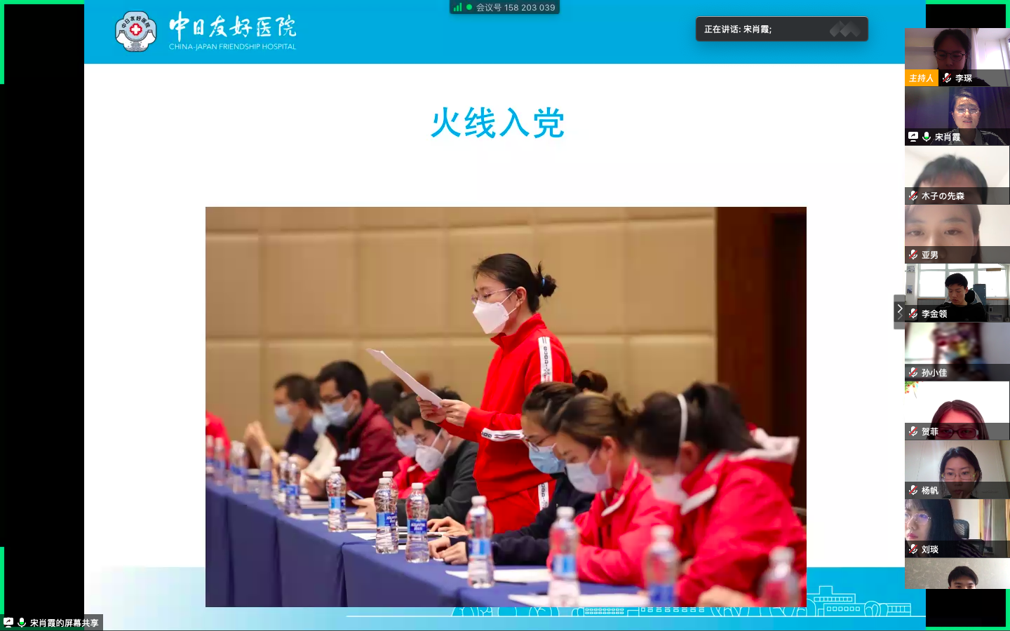 活动上,宋肖霞同志为大家分享了自己的抗疫故事。宋肖霞护士为北京大学医学部营养与食品卫生学系在职MPH毕业,就职于中日友好医院急诊科,在本次抗击疫情中参与了国家第五批援鄂医疗队,并在武汉市同济医院中法新城院区负责危重患者的护理工作。向老师和同学们述说了自己参与援鄂医疗队的心路历程时,在说到2月8日看到肺炎疫情实时动态的页面因为同胞离世变成了灰色的时候,宋肖霞声带哽咽。就是这样心系国家和人民安危的情怀,使宋肖霞护士奋不顾身地加入到援鄂一线的队伍中去。在讲述武汉抗疫的过程中,她展示了很多温暖人心的场景:危重患者成功救治康复出院时为自己竖起了大拇指点赞、在抗疫过程中为患者画了人生中第一朵象征着坚强乐观的波斯菊、在抗疫的火线中加入了中国共产党等等,这些场景都透露着满满的正向力量。宋肖霞护士举重若轻,在抗击一线过程中严峻的形势下一直保持着乐观的心态和昂扬的斗志,深深感染了老师和同学们,本次主题党日宋同志更是牺牲了个人的休息时间,使大家感受到榜样的力量。互动环节同学们和宋肖霞同志积极交流,纷纷向宋护士致以敬意。