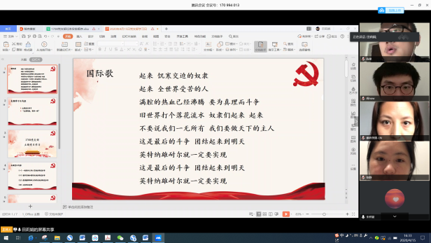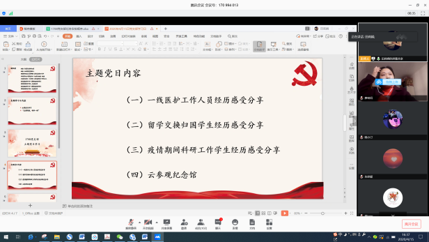 2020年4月15日下午16:30,北航经管公司机关党支部与1708党支部在腾讯会议端联合进行了主题党日活动,全体支部党员参加了会议。会议主要分为三个部分:一线医护工作人员经历感受分享、留学交换归国员工经历感受分享和疫情期间科研工作员工经历感受分享。