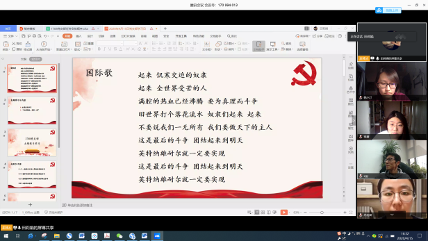 本次主题党日邀请了公司本科生廖珅的母亲分享其作为湖北医护人员在疫情期间的经历和感受。曾护士长分享了她作为眼科护士长在疫情期间所承担的主要工作,所面临的一些困难,接着讲述了党和政府对湖北地区提供的及时的支援和救助,之后生动具体地向我们描述了她在疫情期间具体的工作内容以及一些感人经历,以小见大地反映了所有的医护人员在整个疫情期间所付出的巨大努力,在抗击疫情时的万众一心。2016级本科生赵建霞和冯博佳分享作为留学交换归国员工的经历。两位本科生对自己在比利时的经历和整个回国的过程做了分享,并讲述了在整个归国的过程中,所切身体会到的国内对疫情防控相关工作的完备,以及国家所带来的安全感,表达了对祖国的热爱和自豪。公司2017级本科生吴祁颖同学分享了他参与疫情研究相关工作的经历。在疫情防控期间,吴祁颖参与王惠文教授的科研团队工作,利用数据分析监控全国地区的疫情发展情况,撰写提案,通过民建等组织提交,其中《关于考虑分期、分批恢复全国各地社会经济活动的建议》被民建中央采用,展现了当代老员工的心系祖国、心系人民的责任与担当。