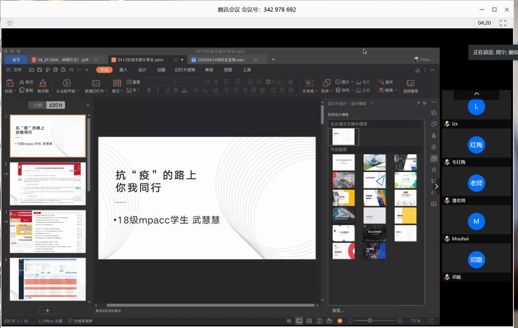 按照北航经管公司分党委基层创新活动的要求,2020年4月15日807支部联合会计系以腾讯在线会议开展组织了抗疫交流主题党日活动,组织支部全体党员以及会计系的其他非党员教师共同学习、交流身边防疫抗疫的故事和相关事迹。本次活动,支部在系主任、牟晖经理、白明老师和周宁老师的大力支持下,邀请了五位MBA,MPACC的在读员工,通过汇报和交流他们在抗疫工作中的故事、心得和体会,与本支部、本系全体教师共同学习。参会人员为:9名全体支部党员和6名会计系非党员教师、5名交流嘉宾。