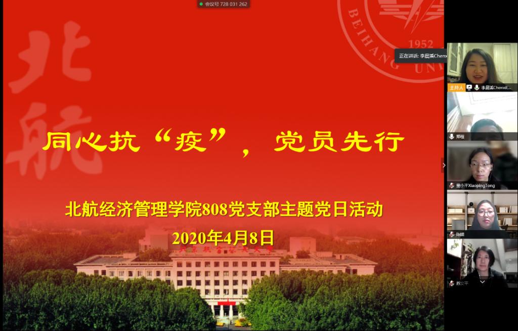 为更好在打赢疫情防控阻击战中充分发挥基层党组织战斗堡垒作用和党员先锋模范作用,切实增强坚决打赢疫情防控阻击战的责任感和使命感,808教工党支部于2020年4月8日晚8点通过腾讯会议,在线召开了“同心抗疫,党员先行”主题党日活动。该活动邀请了工作在抗疫一线的郑程、陈天照、童小平三位同志分享他们在疫情防控阻击战中的抗疫故事。本次参与主题党日活动的人员有808教工党支部全体党员、特邀分享嘉宾以及研究生ZY1808(三)党支部党员代表。经管公司党委书记刘志新、研究生指导主任单伟也参与活动并进行指导。本次活动由808教工党支部书记李晨溪主持。