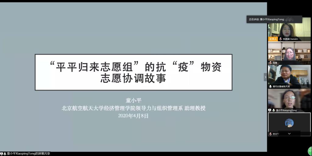 主题党日活动的最后一位分享人是808党支部的青年党员童小平老师,她在滞留湖北老家期间,成立了成立“平平归来”志愿组,协调抗“疫”物资、捐款,对接帮助了30余家医院。在分享中,童小平老师先对其志愿者团队的组建初衷、组建过程、具体工作等内容进行了介绍,讲述了她对于疫情、志愿团队工作的感悟,也表示作为党员,她希望能够通过志愿工作为国家和社会尽一份力。最后童老师也与大家分享了目前她基于志愿工作所进行的研究,希望能基于自身专业知识对该问题进行分析,对志愿工作体系的完善给予建议。