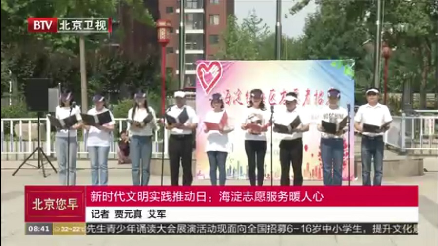 当日,北京卫视对此次志愿活动进行了采访和报道,我支部成员在文艺汇演中表演了诗朗诵《我们是青年志愿者》以及男生独唱《往日时光》,展现了新时代青年志愿者的风采。