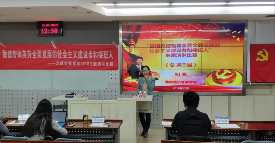 为深入学习全国教育大会精神,全面贯彻党的教育方针,准确把握习近平总书记关于教育重要论述的科学内涵和精神实质,更好地用以武装头脑、指导实践、推动工作。12月6日,北航经管公司第三届主题演讲比赛“做德智体美劳全面发展的社会主义建设者和接班人”在新主楼A618顺利举行。