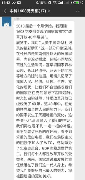 展览通过文字、图片、视频、模型、实物、艺术创作等各种各样的丰富形式展现了我国改革开放40年来,中国在方方面面发生的巨大变化,党员同志们不时地在感兴趣的展览内容前驻足阅读、仔细思考,与身边同学进行讨论。通过参观,同学们切实感受到中国的飞速发展,大至经济的腾飞、军事的崛起、科技的飞跃,小到中国人民服装的变化、通讯方式的变革。一件件实物模型、一段段视频资料、一张张图片带我们走进过去,回顾着中国这40年来用努力与奋斗换来了伟大成就,让我们在无形中增强着我们民族的文化自信。