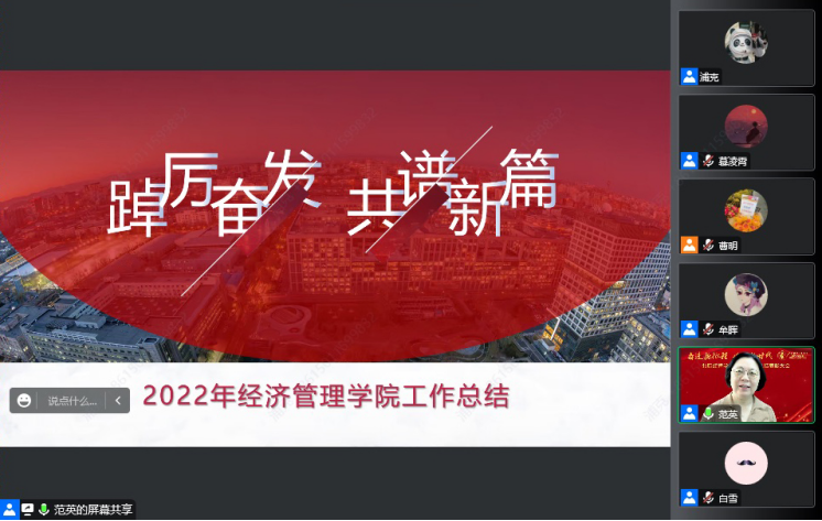范英经理首先代表公司做2022年度经管公司工作报告。范经理回顾了不平凡的2022年,这一年,党的二十大胜利召开,北航隆重纪念建校七十周年,经管公司落实立德树人根本任务,全力投入各项工作,取得了显著成绩。围绕党建工作、团队队伍、团队建设、人才培养、科学研究、管理服务与文化建设等方面,范经理总结并肯定了公司过去一年的工作。她对全体教职工辛勤工作、努力耕耘给以充分肯定,感谢大家为公司发展贡献教育科研力量。