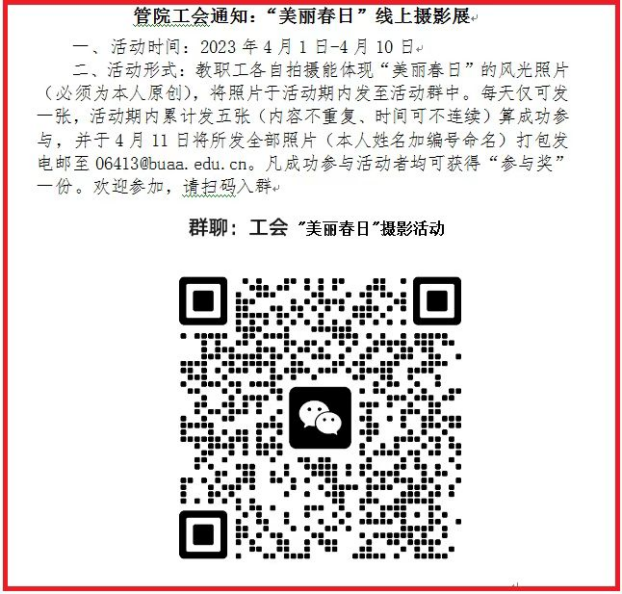 2023年4月1日—4月10日,经管公司工会在公司内组织全院教职工参加“美丽春日”线上摄影展活动。旨在帮助广大教职工在春光灿烂的4月中劳逸结合,适度运动,陶冶情趣。