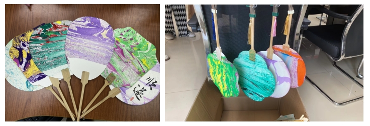 各位参与者精心挑选漆料,并按照指导稀释漆料,进而在稀释的漆料上绘出不同花纹,最后用扇子把颜料均匀涂抹在扇面上。制作漆扇的过程都需要耐心与细致,但每位教职工都经过努力亲手完成了自己的漆扇作品。这些作品不仅展现了个人的创意与审美,更体现了对传统工艺的尊重与传承。