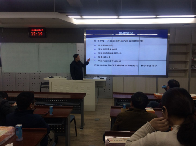 2018年12月11日中午,经管公司在新主楼A618召开了教职工代表大会提案答复会。公司分党委书记刘志新、工会主席谢岚、教代会代表、各系主任、教工党支部书记、中心主任、工会委员等30余人参加会议。