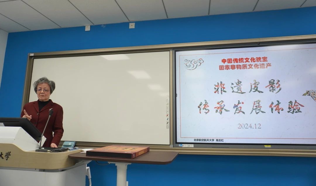 高志红向同学们介绍了非遗皮影的历史起源与文化内涵。作为中国非物质文化遗产之一、中华传统文化独一无二的瑰宝,从有文字记载以来,皮影戏已经走过了两千多年的历史。高志红以深入浅出的方式,生动地阐述了皮影艺术的悠久历史,借助一系列图片和视频资料,直观地为同学们呈现了皮影艺术的独特魅力及其在不同地域文化中的多元化表现形式。