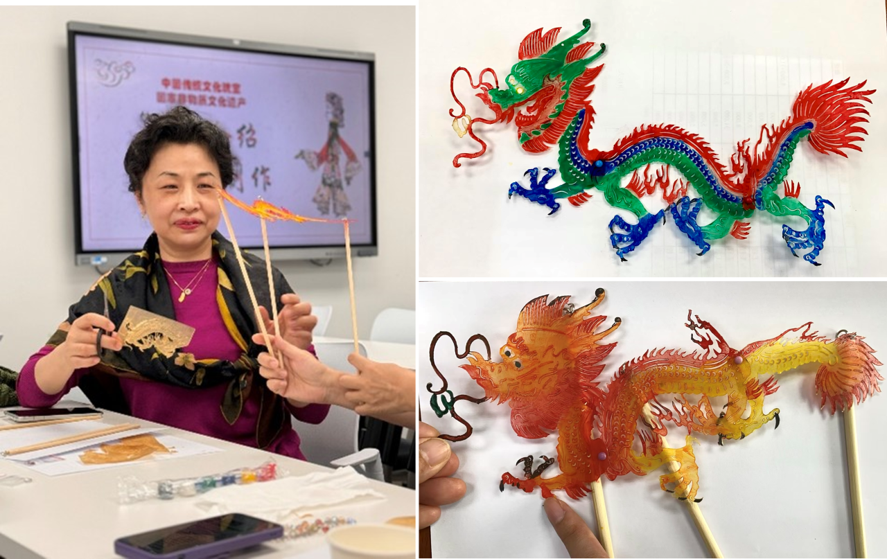 在理论讲解后,参与者们亲身体验了制作皮影的精髓。首先是精雕细刻的镂刻工艺,大家在高老师的悉心指导下,将雕刻好的皮影半成品沿着边线小心地裁剪成龙形的具体轮廓。随后,大家根据个人的喜好为皮影上色,调和出独具个人特色的色彩,涂刷在皮影的表面。色彩的搭配展现了参与者们的创意与对皮影艺术的热爱。最后,大家使用彩钉和金属圈将皮影的各个部分连接,并通过木头支架将皮影固定,使得其能够通过支架的控制,呈现出栩栩如生的形态,仿佛一条龙在灯光下翩翩起舞。