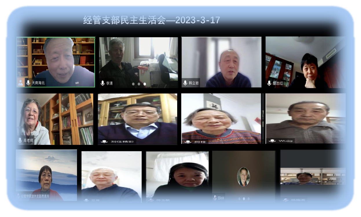 根据公司离退休教职工党委的工作部署和要求,经管退休支部3月17日召开线上年度总结和民主评议会,畅谈学习党的二十大精神体会;总结一年来学习和生活体会,为支部工作提出建议。朱桂芳、邬宽明、李清、张皖生、刘新国、武建国、何玉敏、韩立岩、杨梅英、邹志红老师,和支部高志红、贾素玲、陈向东十三位老师出席了会议,特别是朱桂芳、邬宽明两位八十多岁的老教师,第一次学习使用腾讯会议,非常成功,展现了老年人积极向上的精神。