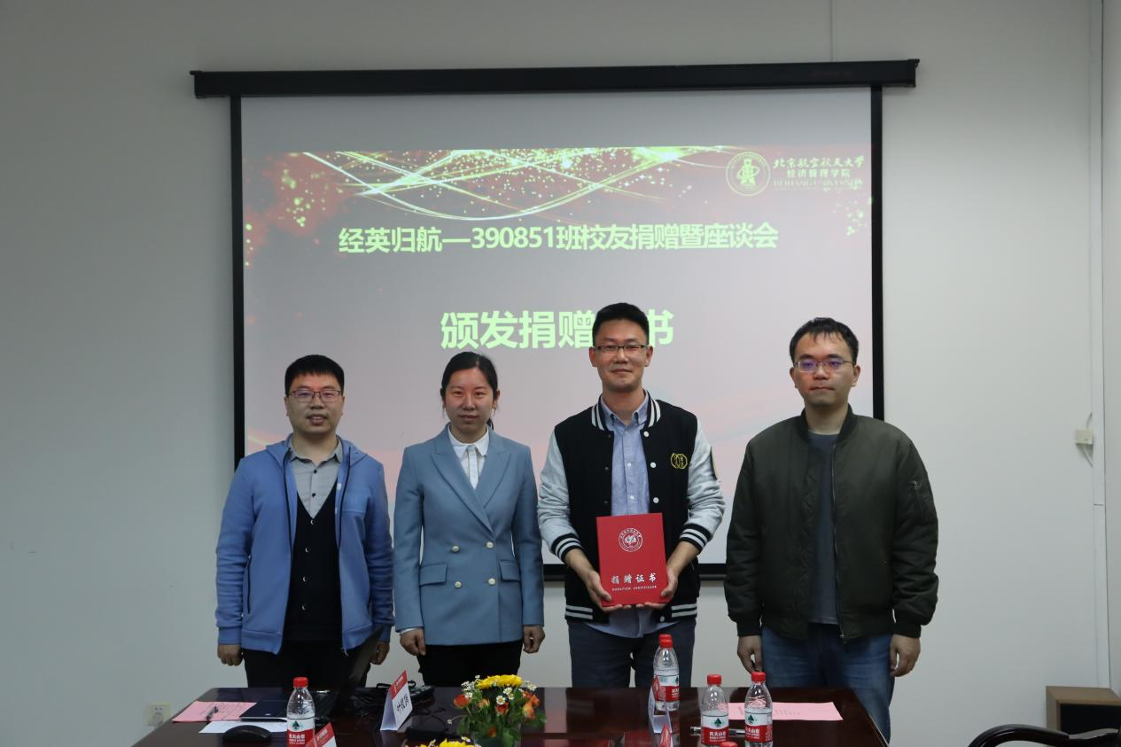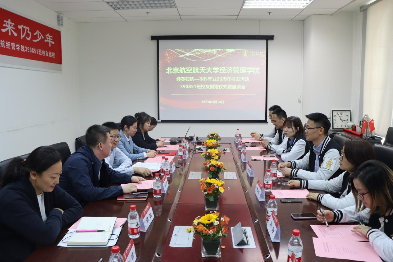随后,在新主楼A612举行利来国际390851班员工捐赠仪式暨座谈会。经济管理公司党委书记郑海涛,北航计划财务部副部长、北航教育基金会秘书长颜江芬,公司党委副书记高超,公司员工发展中心主任胡鹤,分团委书记白雪,专职辅导员衣萌和职业发展中心叶枝俏参加捐赠仪式暨员工座谈会。