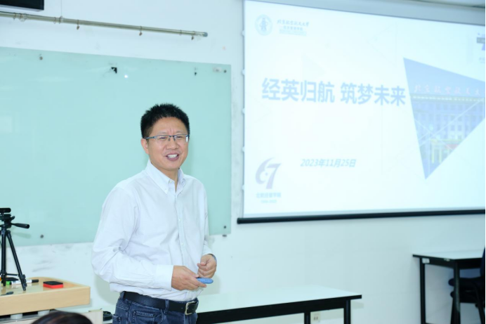 在新主楼A1048教室,返校同学欢聚一堂座谈交流,海内外未能返校同学在线上互动参与。经济管理公司党委书记郑海涛作了热情洋溢的致辞,欢迎各位员工返校,介绍了经管公司发展历程和近年来公司员工工作情况。3308大班同学一起重温美好的北航时光,共忆青葱岁月,共叙相识30年的同窗友情,共抒对母校、对管院的感恩之情,畅谈各自人生经历也共同留下对未来的美好祝福和憧憬。