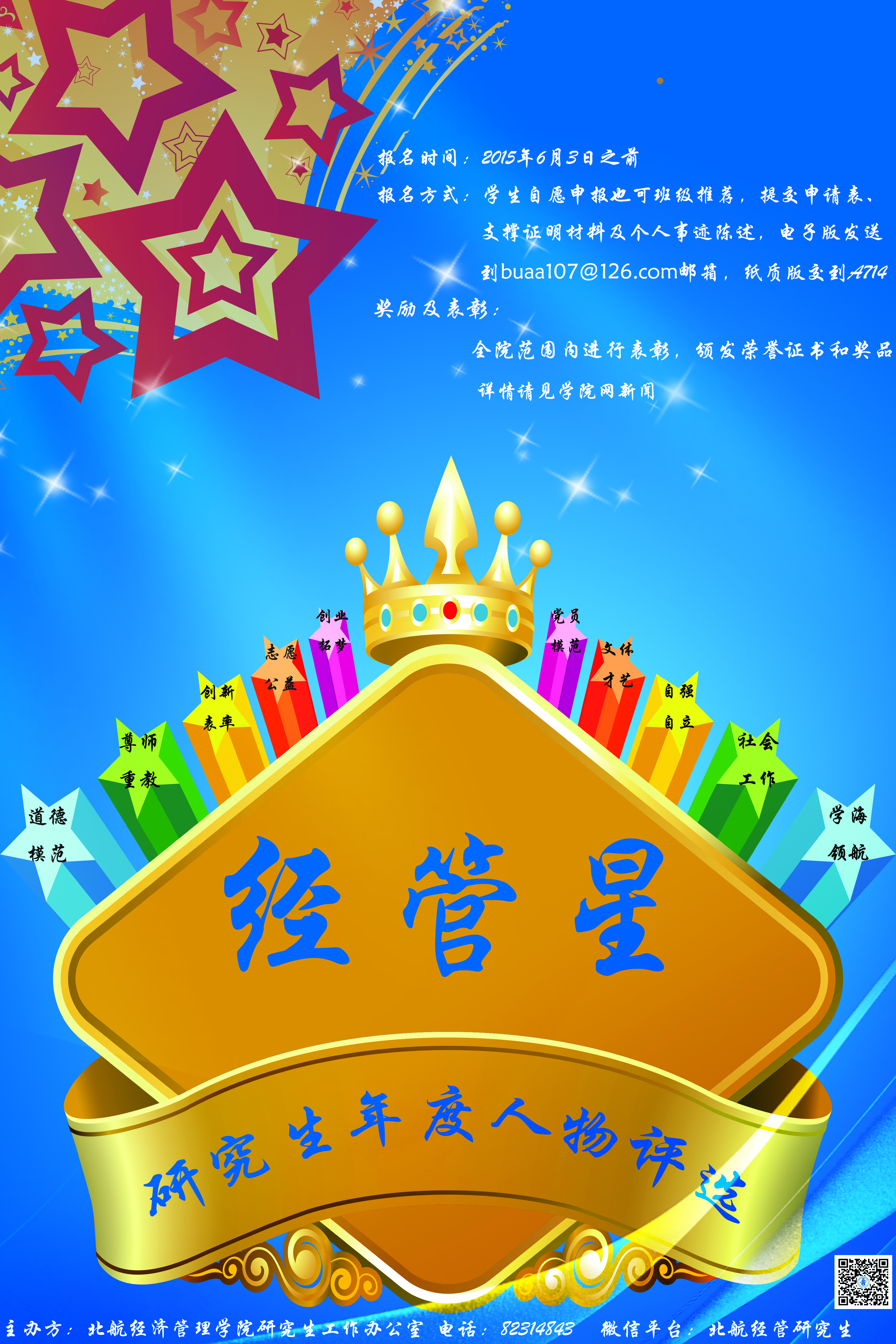 -16日,每日通过“北航经管研究生”微信公众账号对两个类别的提名候选人进行个人展示,支持者需在投票统计期间内,直接回复公众页进行投票。每个评选类别的投票数量不得超过得奖人数的上限。研究生工作办公室将统计出每一类中候选人得奖百分比,以30%的比例计入总成绩。