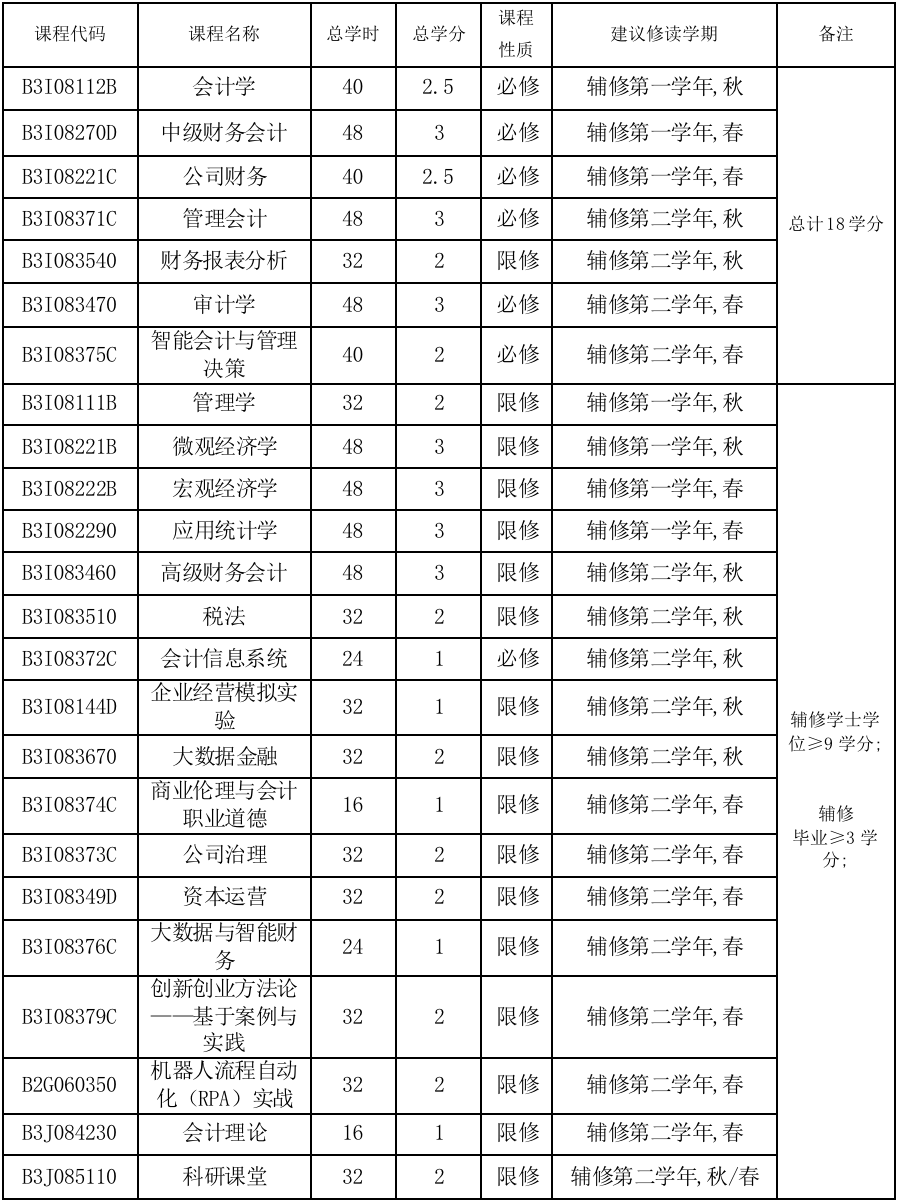 会计学专业最低总学分及课程要求:
