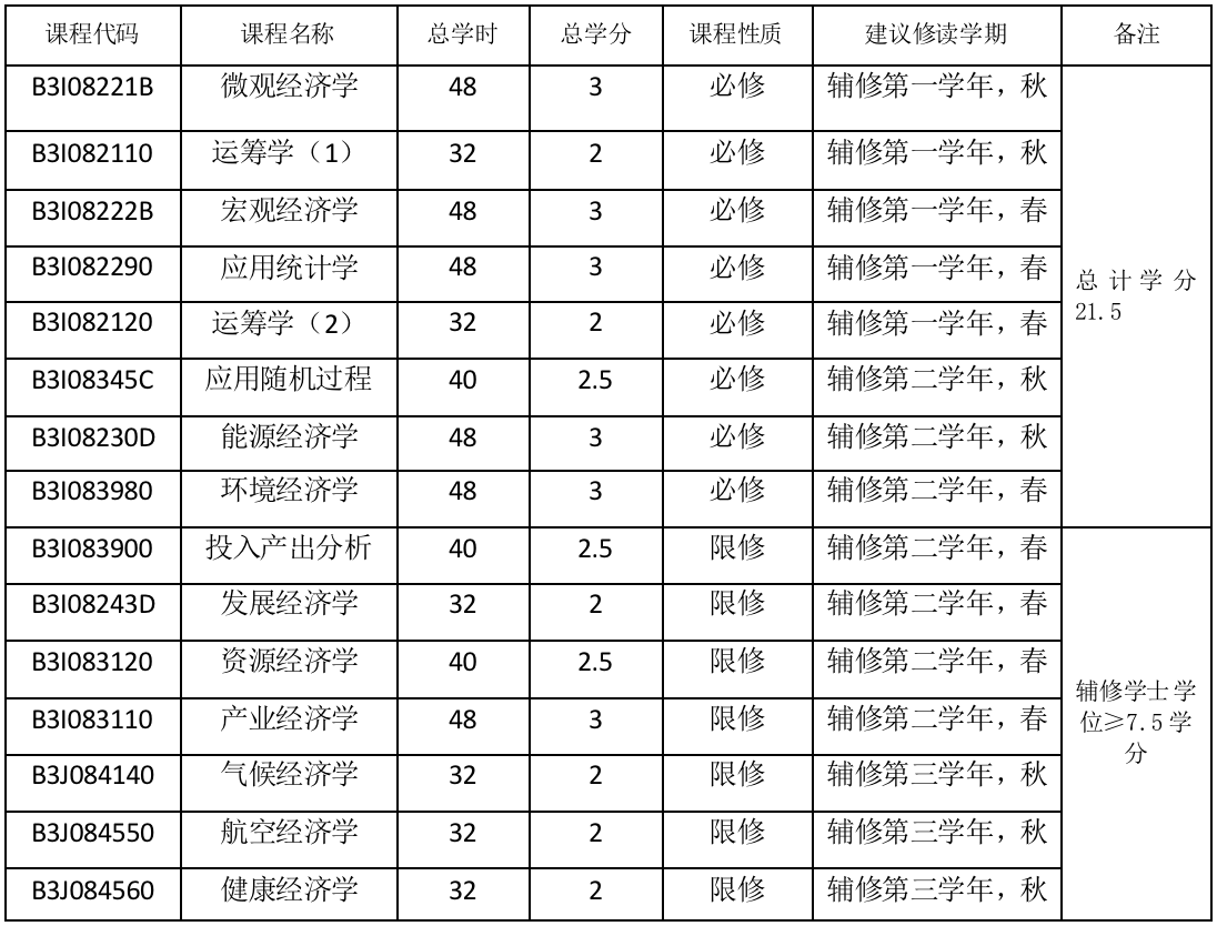 能源经济专业最低总学分及课程要求: