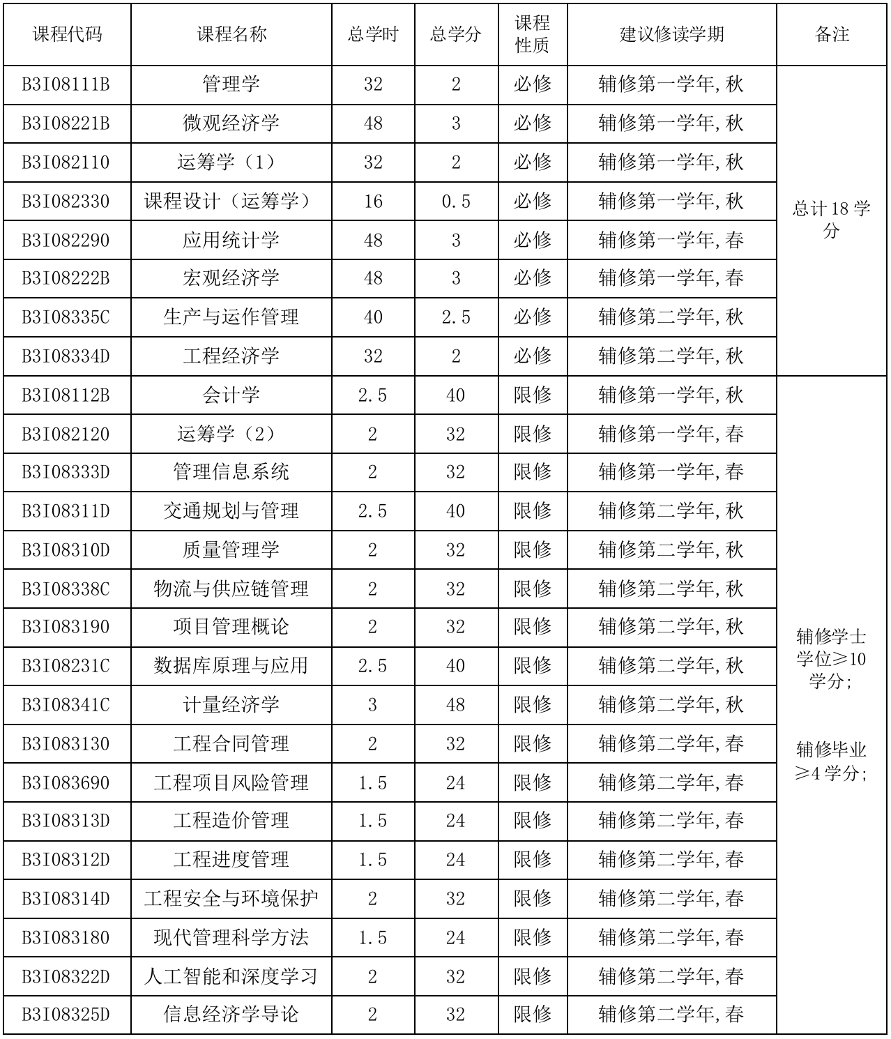 工程管理专业最低总学分及课程要求:
