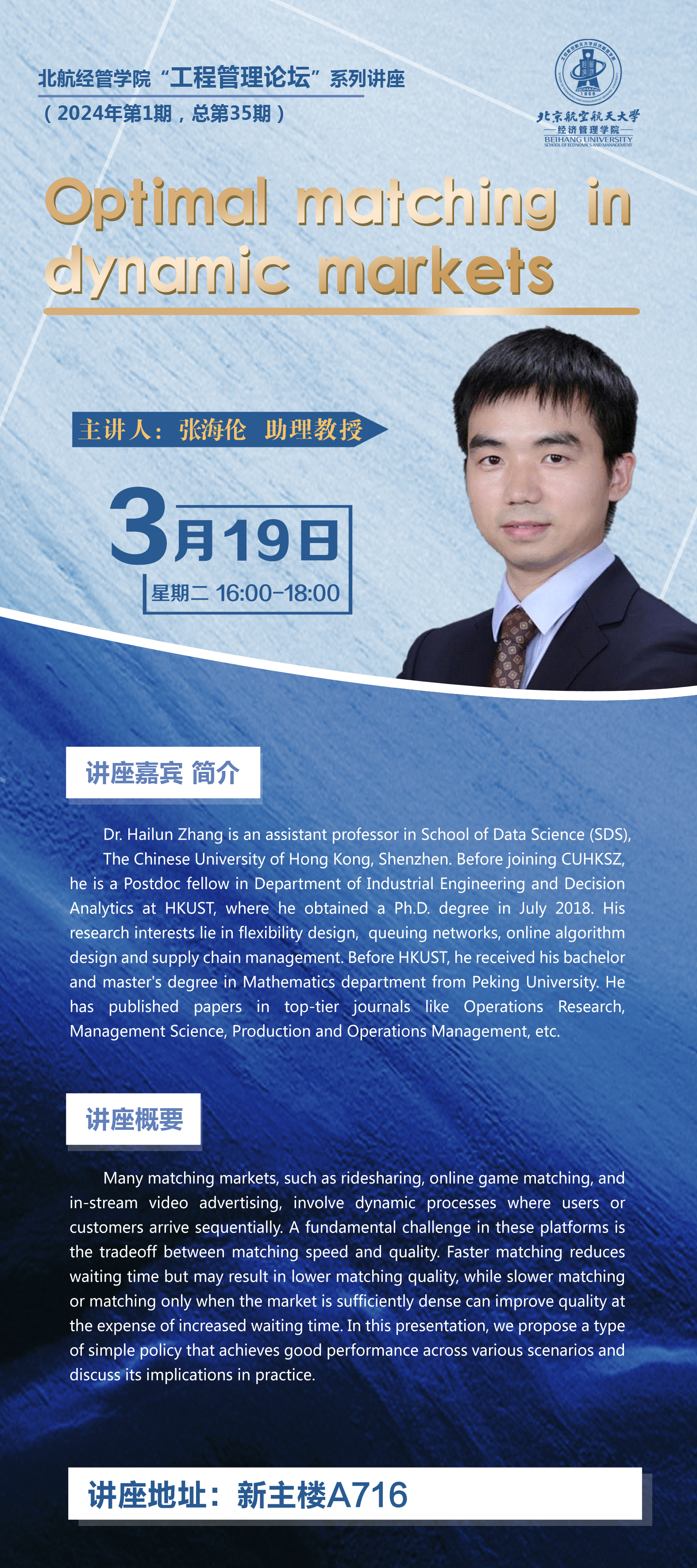 讲座题目:Optimal matching in dynamic markets