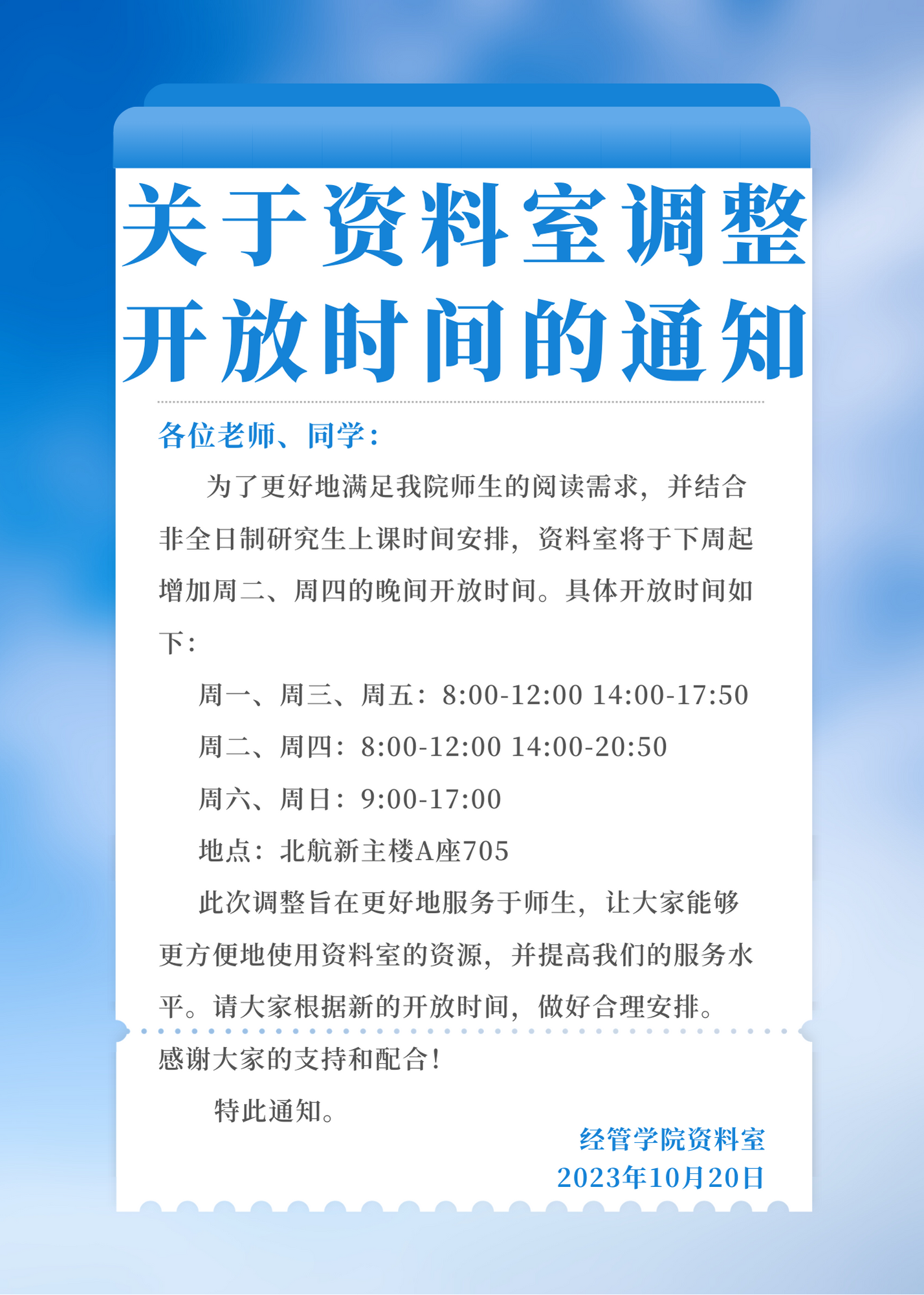 关于资料室调整开放时间的通知