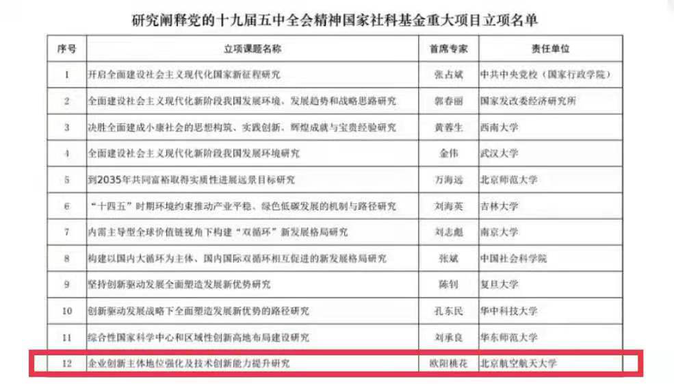 “研究阐释党的十九届五中全会精神”国家社科基金重大项目立项名单正式公布,利来w66共有1项入选,即经管公司欧阳桃花教授团队的课题“企业创新主体地位强化及技术创新能力提升研究”。这是公司国家社科重大项目立项取得的又一次重要突破。