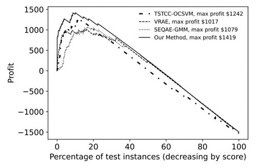 图4:模型成本-收益分析结果(一般而言,在真实分销渠道数据集上,给定每个模型输出的分销商异常得分,我们需要定义一个阈值来判定该分销商是否为异常,进而计算该模型的成本和收益以及对应的经济价值。本实验通过改变该阈值(图中横坐标数值),获得利润曲线。从结果可看出,我们方法的利润曲线在所有基线方法之上,表明我们的方法总体上可获得更高的经济价值。)