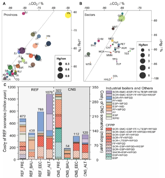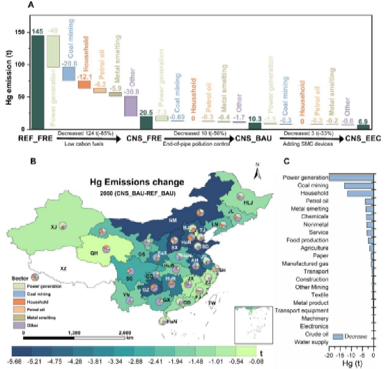 中国作为全球最大的发展中国家,面临着发展经济、改善民生、减污降碳多重挑战,迫切需要以较低的经济代价实现减污降碳协同增效。如何有效地利用协同减排措施来取得碳汞减排最佳效果,即如何以较小的成本有效地减少二氧化碳和汞排放仍是一个难题。本研究通过构建“能源-环境-经济”综合评估模型框架在省级层面探究气候、空气污染和汞减排政策的最佳实践组合,发现中国将碳中和政策与当前的空气污染控制政策相结合,是具有成本效益的协同减排路径,这将在2060年这一年减少6914百万吨(88%)的二氧化碳和71吨(88%)的汞排放,并将为中国节省了3.84亿元的汞减排技术成本。