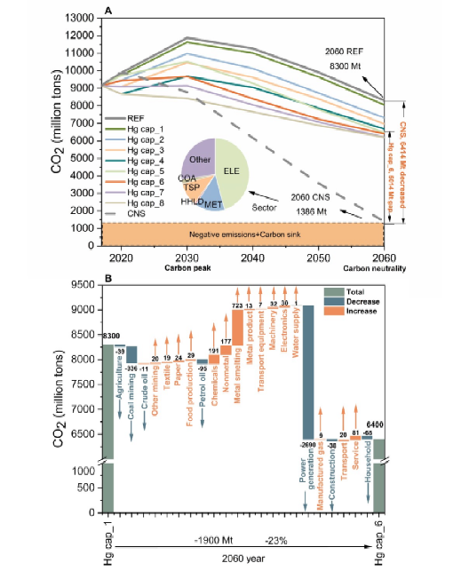 从全国尺度来看,实施碳中和政策,将使中国燃煤相关部门的大气汞排放基本实现近零排放,2060年碳中和情景将比基准情景减少85%的大气汞排放。就区域而言,2060年的内蒙古、山西、山东和安徽四省的汞减排量相当于全国总排放量的30%。对于部门,煤电行业、煤炭开采和金属冶炼行业的汞减排量占全国总排放量的69%。