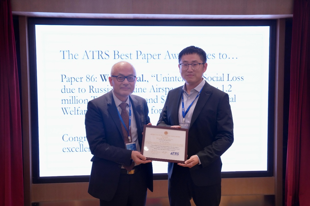 本届会议汇聚了来自全球28个国家和地区的391名专家学者,围绕“迈向更绿色、可持续且具有韧性的航空业”展开了深入交流。经过两轮匿名评审,论文Unintended Social Loss due to Russia-Ukraine Airspace Closures: 1.2 Million Tons of CO₂ and $14.74 Billion Social Welfare Loss Annually for Airline Industry(俄乌空域关闭引发的非预期社会损失:航空业每年额外排放120万吨CO₂并造成147.4亿美元社会福利损失)脱颖而出,荣获本届会议唯一最佳论文奖(Best Overall Paper Award)。最佳论文奖是世界航空运输学会世界大会的最高学术荣誉,旨在表彰对航空领域具有重要贡献的研究成果。